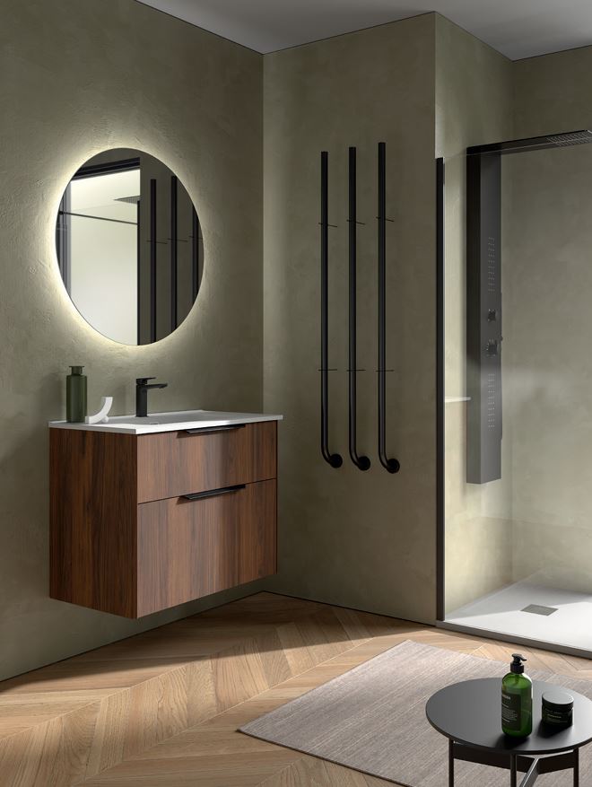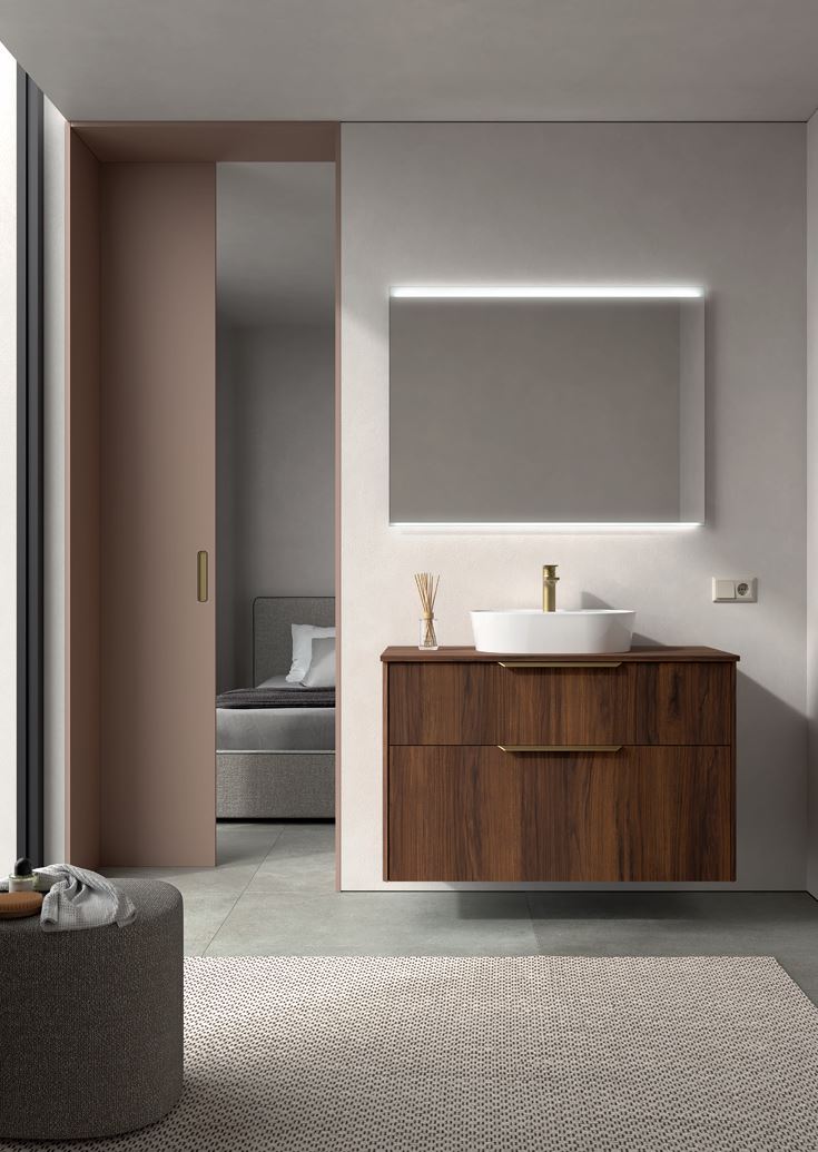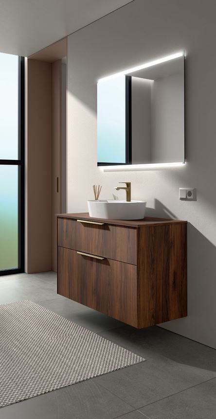 - un meuble à deux tiroirs Noyer Maya ou White S, d'un plan de toilette VARMEGA en céramique et du miroir LINIIA.